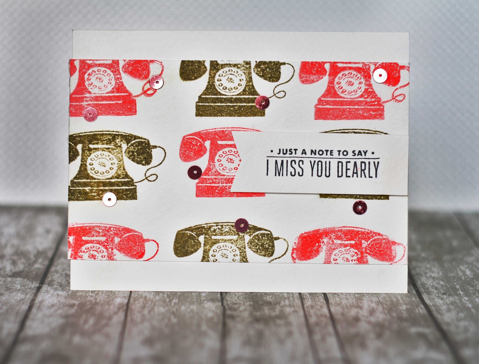 Today I tried to create quick card using only stamps and sequins as embelishments. I used stamps from American Crafts: one with the telephone for a background and other one - sentiment. For  a backgroud I used Adirondack Shadow Inks and for a sentiment - StazOn. It took me about 10 minutes to finish it. It's super quick and super cute: